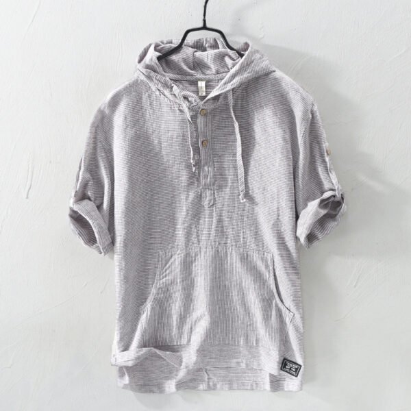 Summer Striped Men’S Hooded Cotton And Linen T-Shirt Drawstring T-Shirt
