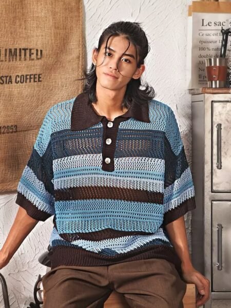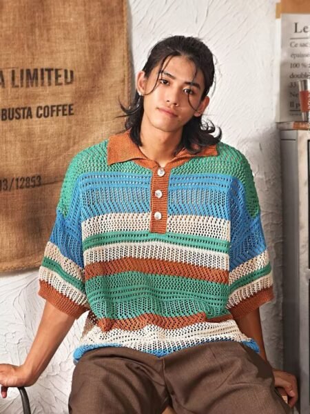 This men’s retro colorblock striped hollow-out knit lapel T-shirt combines vintage style with modern comfort. Featuring a unique hollow-out knit design, it enhances breathability and adds a stylish texture. The colorblock stripes create a bold and eye-catching appearance. Designed with a lapel collar, it offers a smart casual vibe suitable for various occasions. Made from lightweight knit fabric, it ensures comfort during warm days. Perfect for casual outings, vacations, or streetwear looks. A great choice for men who love retro-inspired and fashionable clothing.