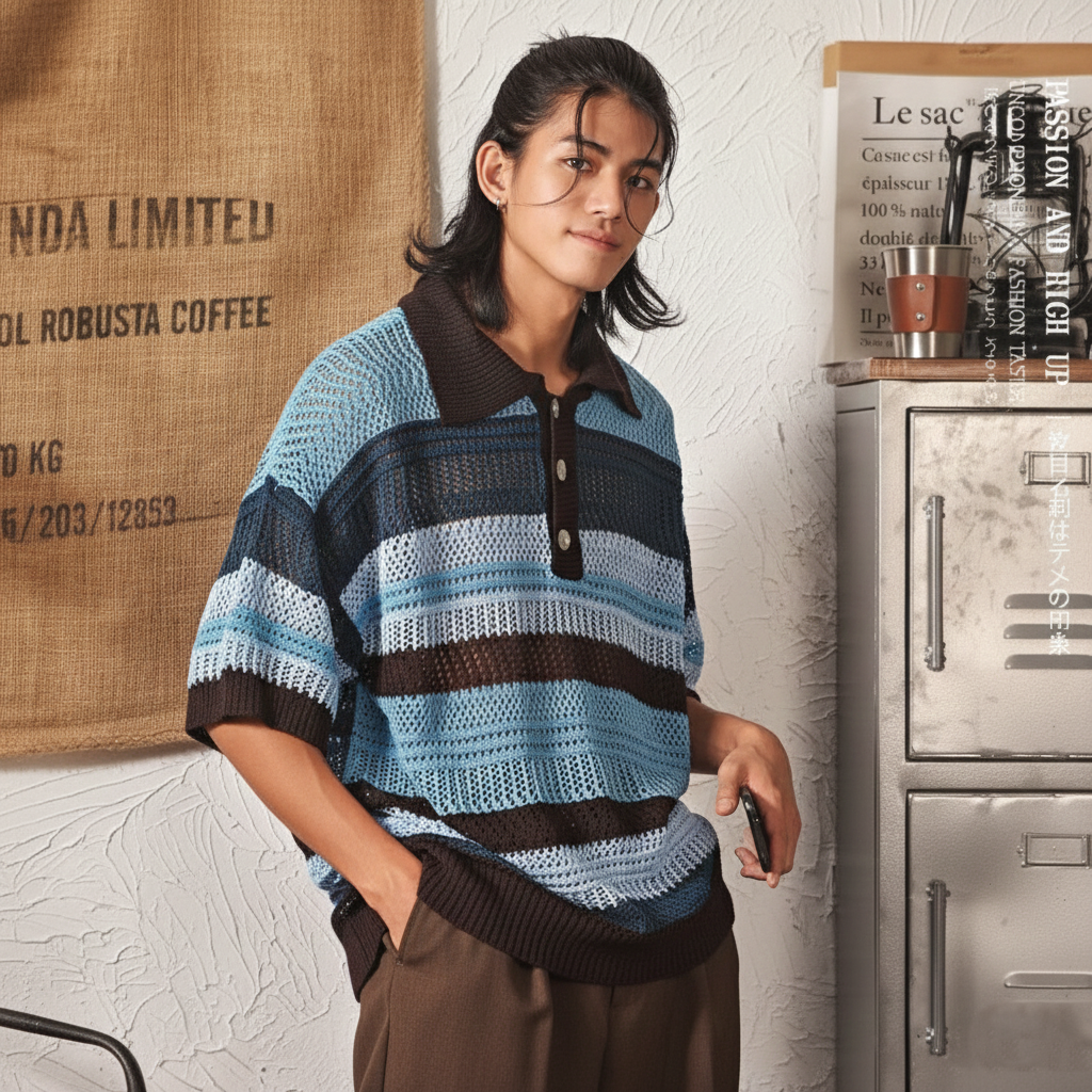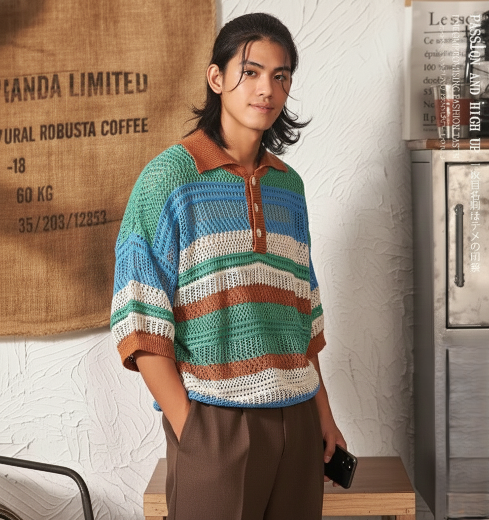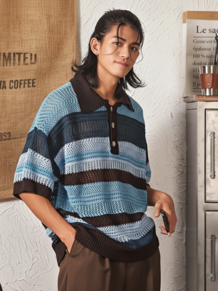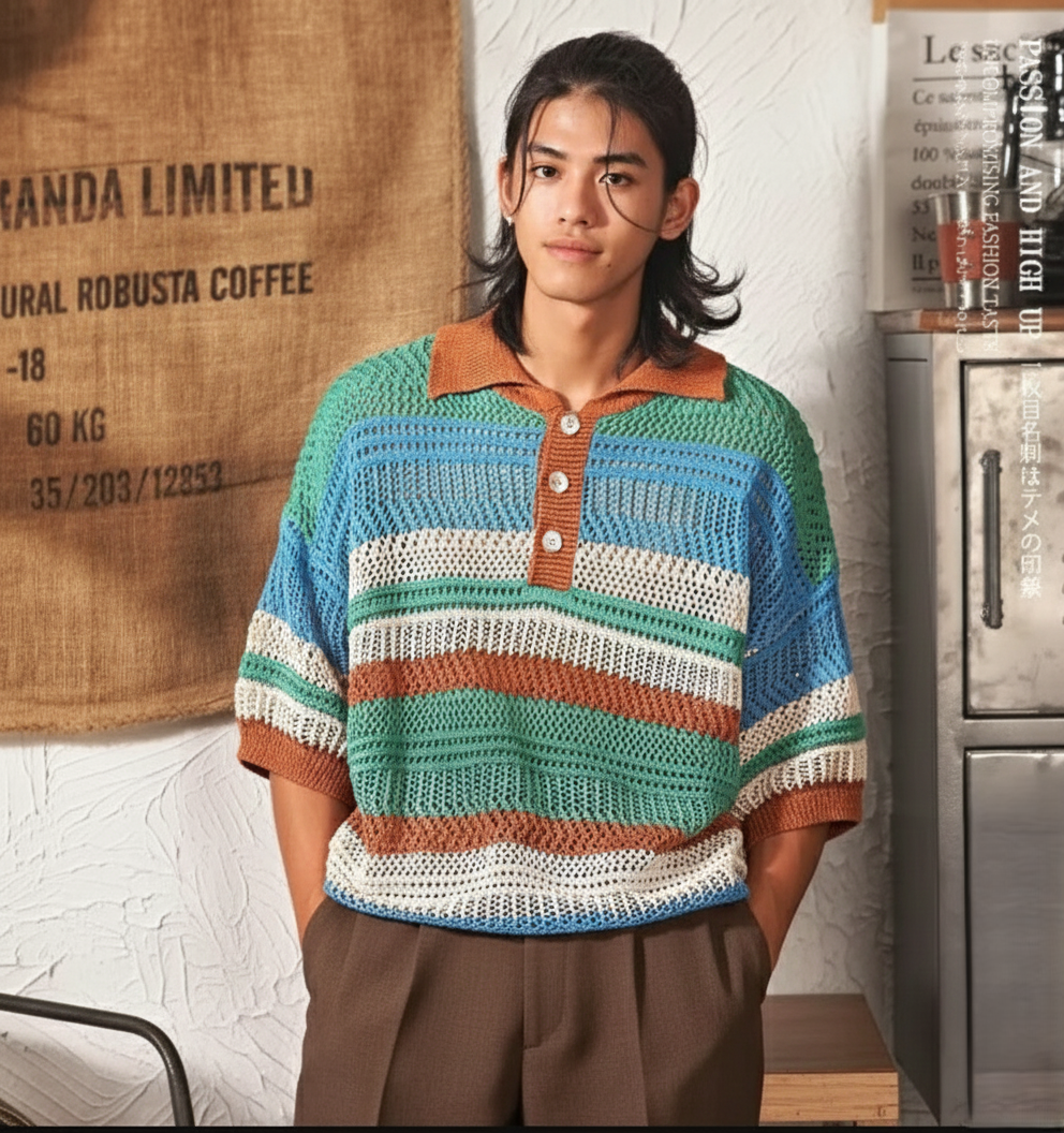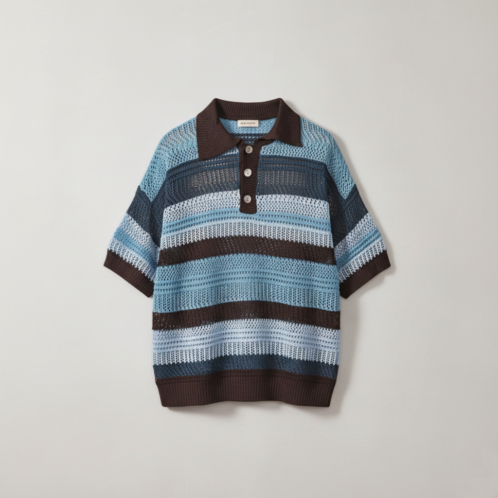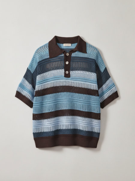 Color-block Striped Hollow-out Knit Retro Lapel T-shirt