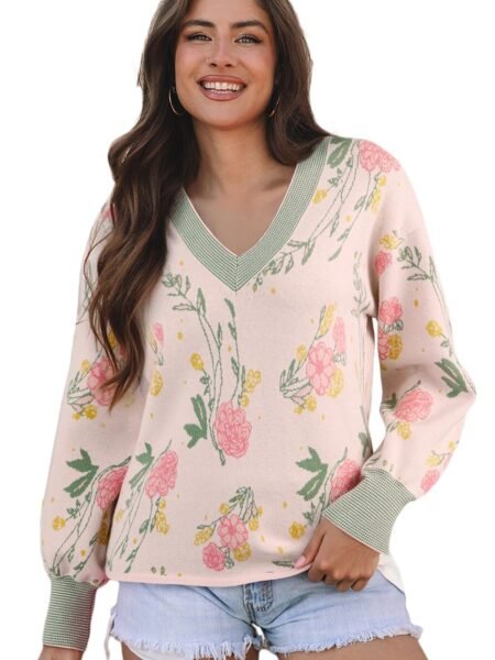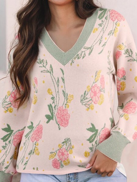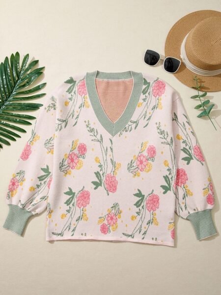 Floral Pattern Striped V-neck Loose Sweater