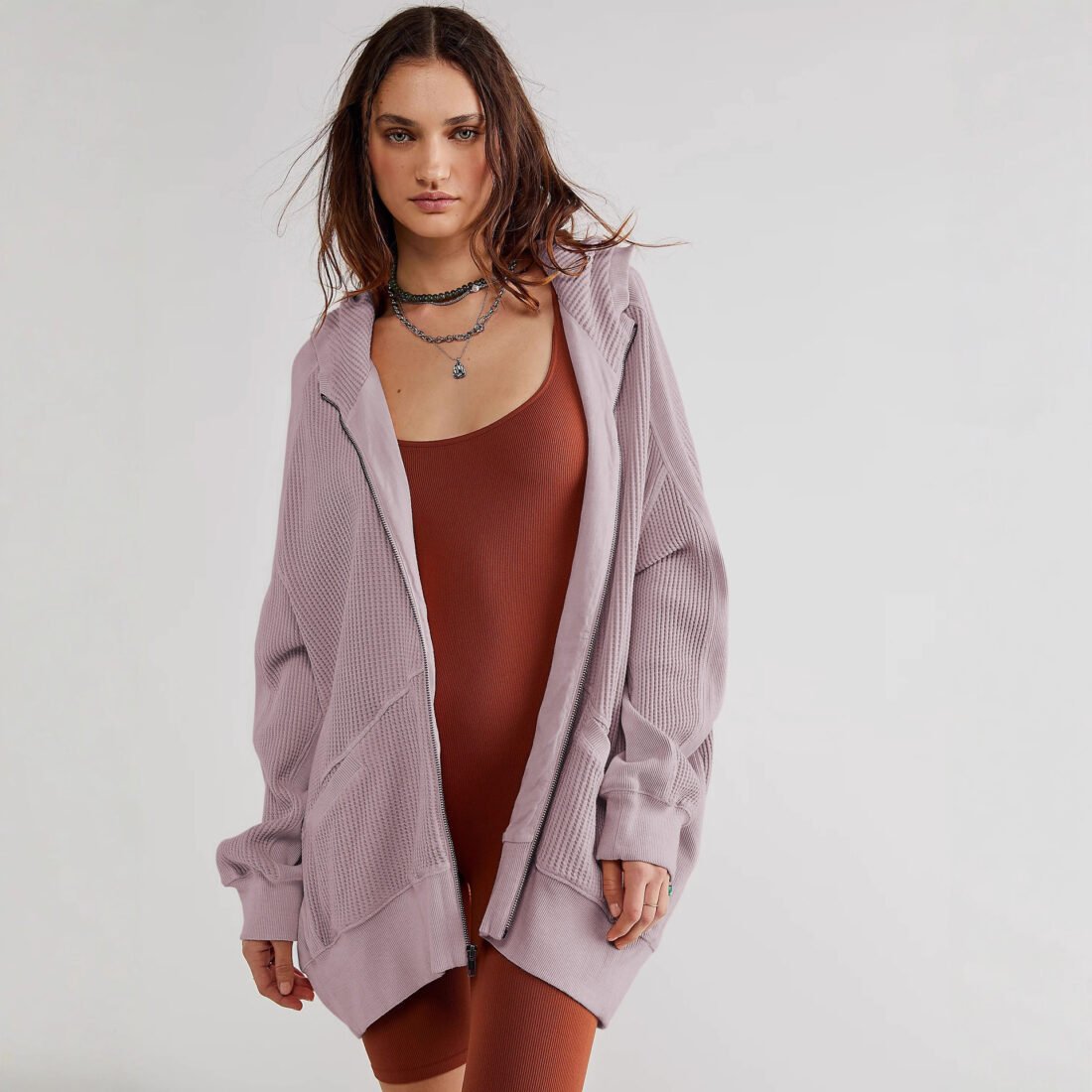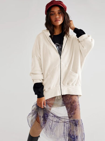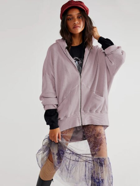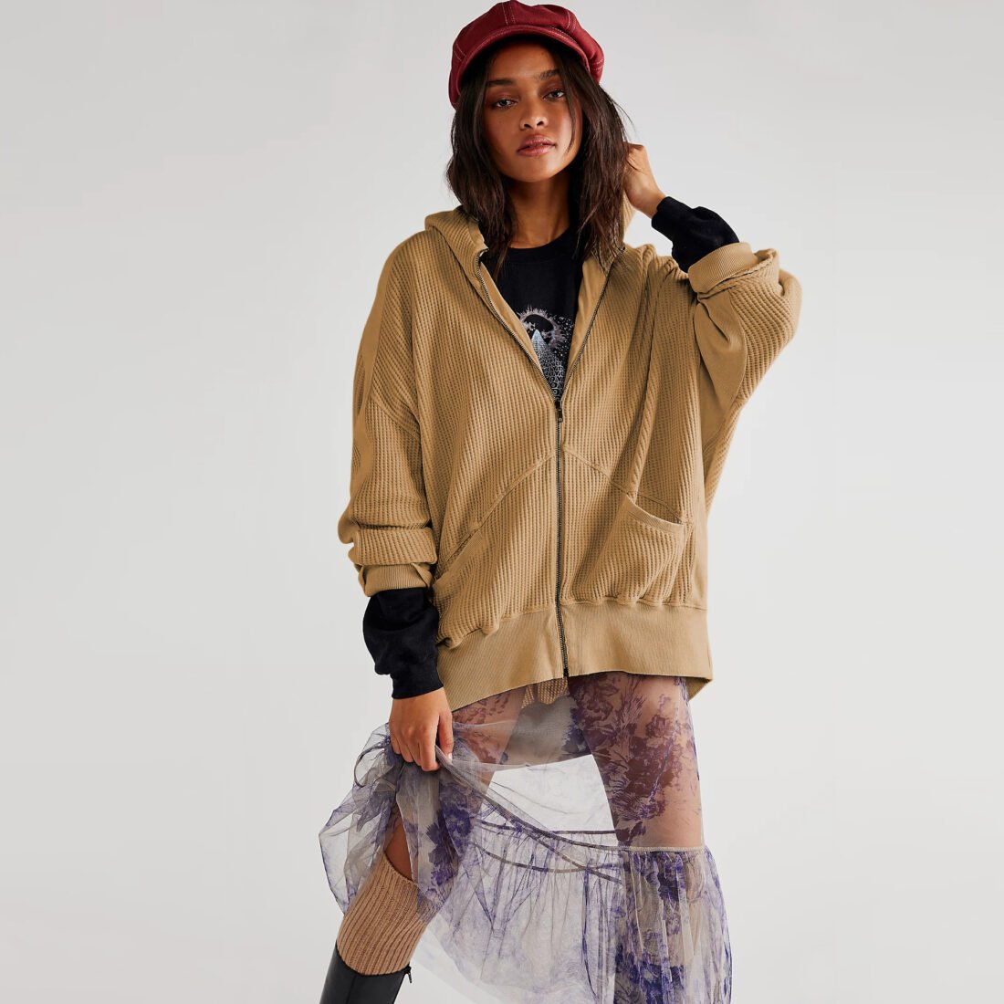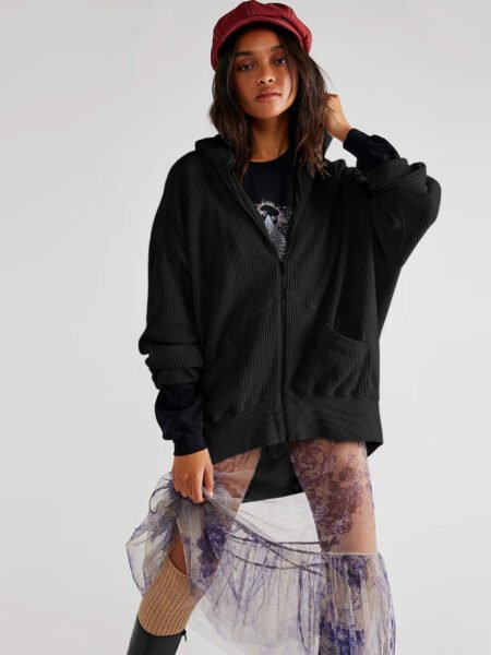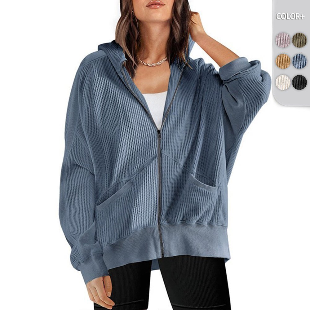 Waffle-knit Cardigan With Zipper Relaxed-fit Women's Hoodie