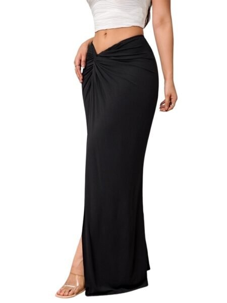 French High Waist Slit Black Satin Skirt