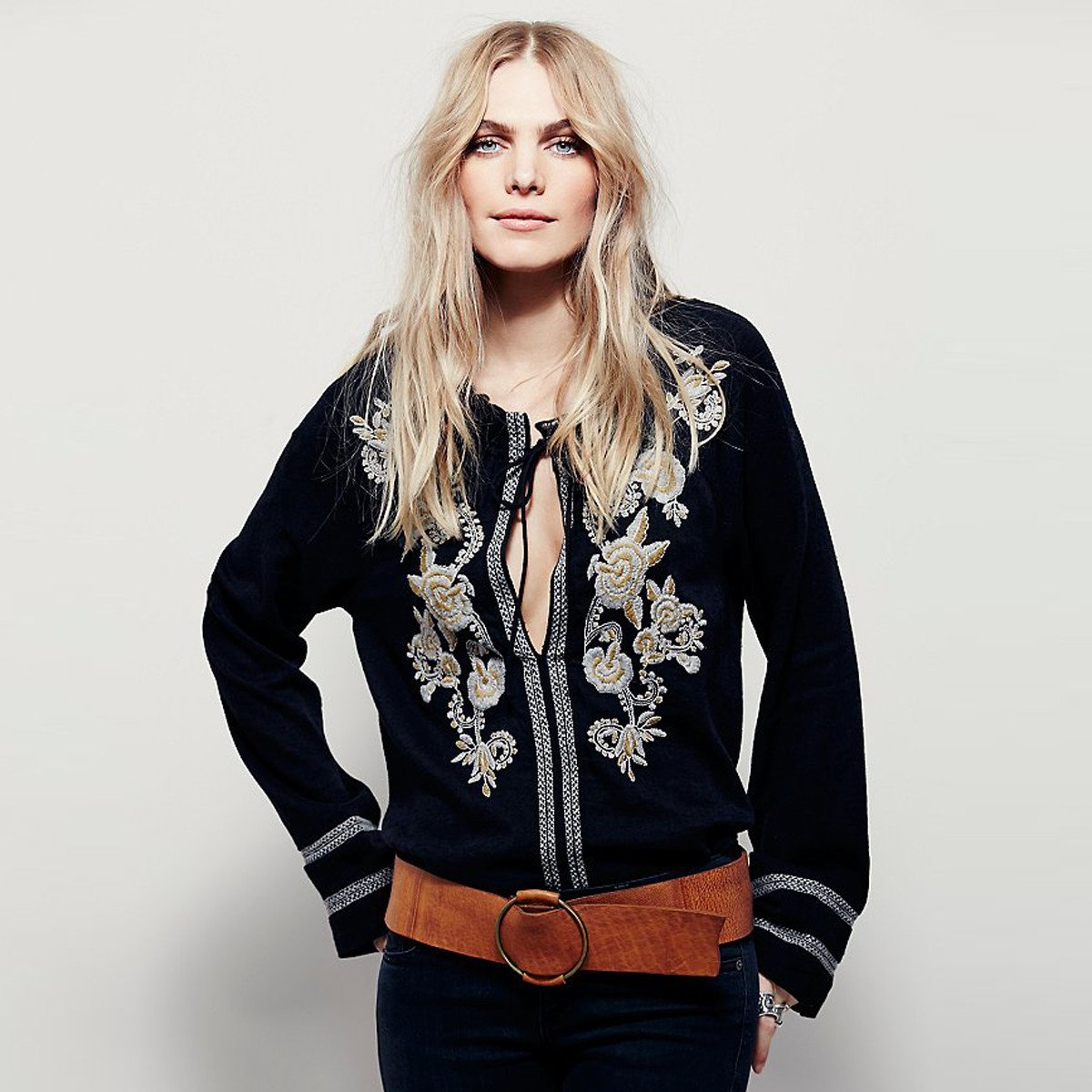 Bohemian Lace-Up Embroidered Top – Floral Casual Stylish Ethnic Shirt